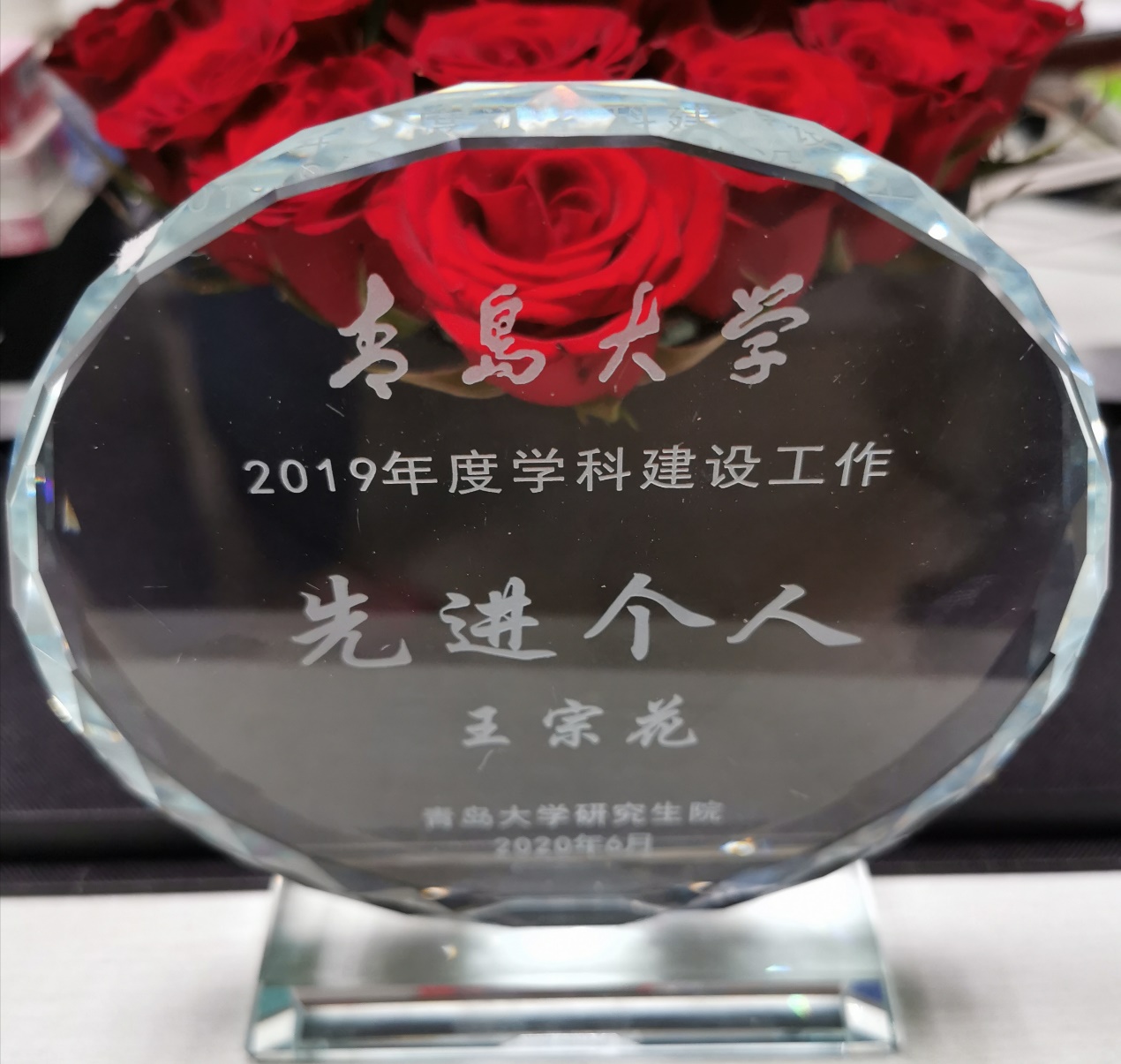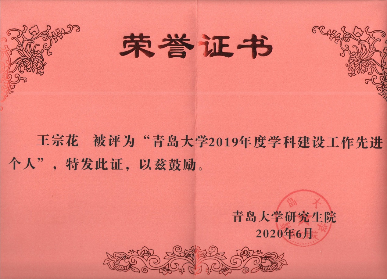 我院化学学科负责人王宗花教授荣获“青岛大学2019年度学科建设工作先进个人”荣誉称号