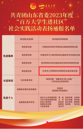 近日,共青团山东省委公布了2023年度“百万大学生进社区”社会实践活动表扬通报名单,我校5个先进集体、1个示范项目、10名先进个人获省级“百万大学生进社区”社会实践项目表彰。其中,我院青岛大学H(氢)心之光志愿服务协会荣获共青团山东省委2023年度“百万大学生进社区”社会实践活动“先进集体”称号。