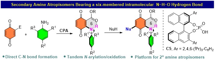 二级胺作为药物活性分子中最常见的官能团之一,其轴手性构筑自2009年发现以来一直是一个挑战,主要由于相对其它轴手性,二级胺轴手性具有更高的旋转自由度,造成其不对称控制非常困难。近日,青岛大学刘人荣教授课题组通过直接构建C-N键,利用分子内氢键作用力,为二级胺轴手性的不对称合成提供了一条高效策略。该研究工作得到了山东省泰山学者青年专家项目和青岛大学启动资金的资助。