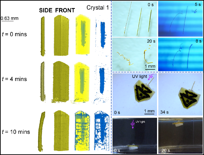 近日,yl23455永利官网王国明教授团队在光机械响应晶体领域取得重要研究进展,研究成果以“Bending, Twisting, and Propulsion of Photoreactive Crystals by Controlled Gas Release“为题发表在国际顶级期刊Angewandte Chemie上(Angew. Chem. Int. Ed.2024, e202403397)。我校为第一完成与通讯作者单位,王国明教授、喻琪副教授和纽约大学Pance Naumov教授为共同通讯作者。第一作者为我校2022级在读硕士研究生于春娇,共同一作为我校硕士毕业生姜晓帆(目前博士就读于北京师范大学),该工作得到了国家自然科学基金等项目的资助。
