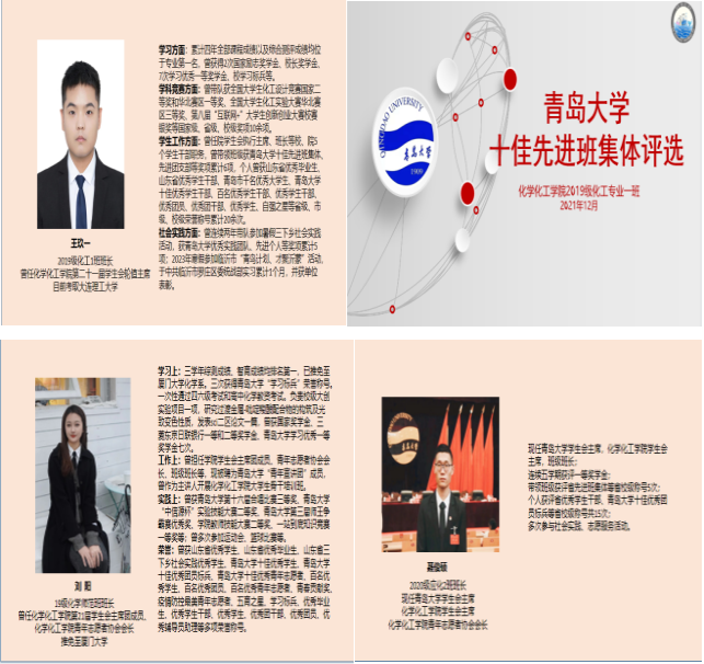 2019级化工1班曾荣获青岛大学十佳优秀班集体、先进团支部等荣誉称号,团支书王炳仪同学现场重现了评选答辩时的整个流程,并重点从加强班级建设、提高班级凝聚力、打造优秀班集体等方面详细展开,为低年级建设优秀班集体提供了宝贵经验和有效借鉴。
