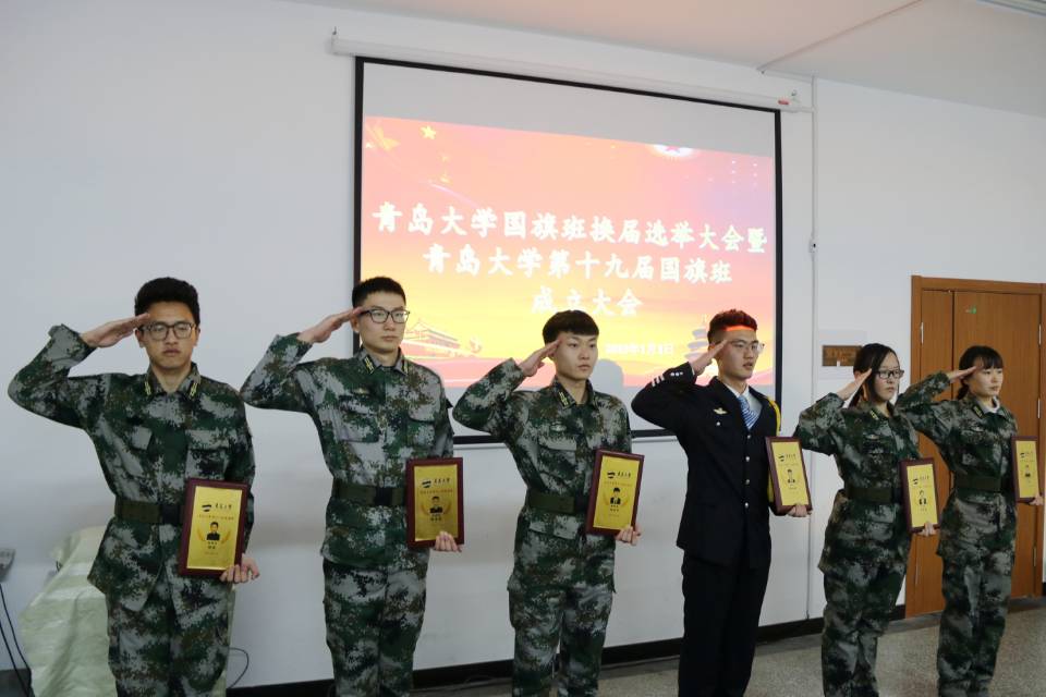 大会伊始,第十八届青岛大学国旗班班长钟江斌进行了工作总结汇报;第十八届国旗班队员参加竞选,张国庆全票当选第十九届国旗班班长,史志军、孙栋、李晨晨、官倩文、孟璇当选第十九届国旗班副班长。