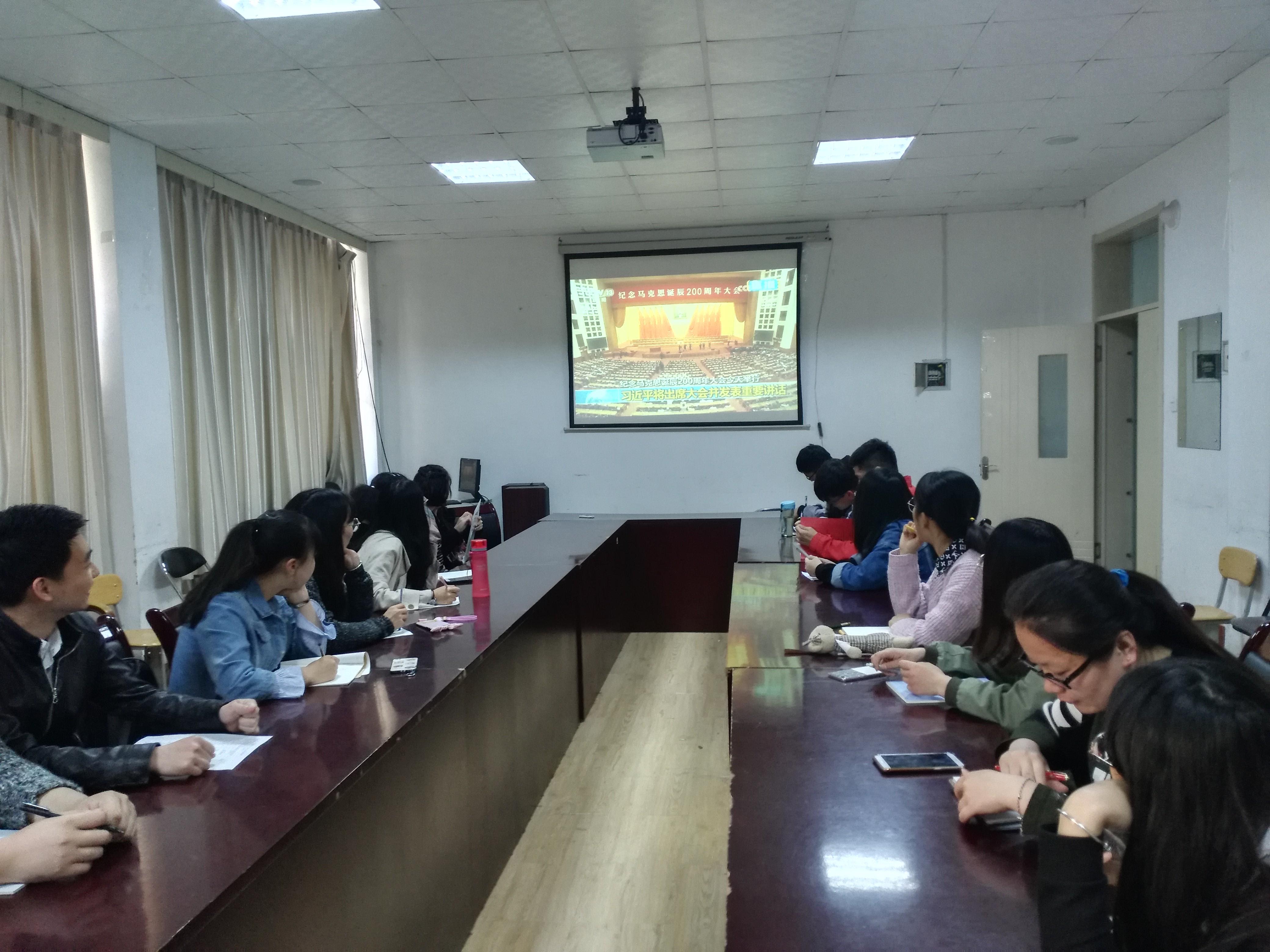 5月4日上午10:00,yl23455永利官网师生在慎思楼208集中收看纪念马克思诞辰200周年大会,认真聆听习近平总书记在纪念大会上的重要讲话。学院教师代表、学生党员、入党积极分子50余人一同观看了直播。