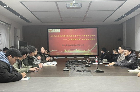为进一步推进2023届高校毕业生就业工作,搭建优秀校友企业和毕业生的双向交流平台,拓宽毕业生就业渠道,在青岛大学合并办学三十周年之际,我院举办“青大情燕归巢”校友企业专场招聘会。浙江新和成股份有限公司应邀参加,提供专业技术、研发工程等岗位100余个,会议由学院党委副书记李咏沙主持。