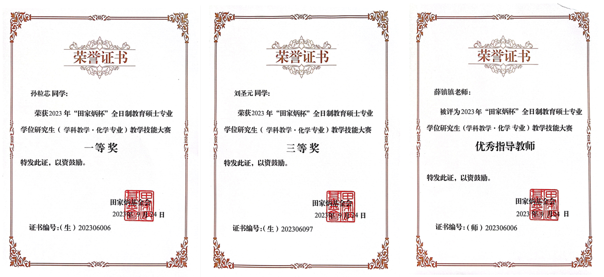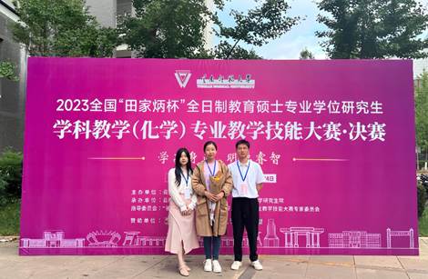 9月22日至24日,2023年全国“田家炳杯”全日制教育硕士专业学位研究生学科教学(化学)专业教学技能大赛决赛在云南师范大学举行。yl23455永利官网万延岚、薛镇镇老师指导的2022级学科教学(化学)专业研究生孙粒芯获一等奖,刘圣元获三等奖,薛镇镇老师荣获优秀指导教师称号。